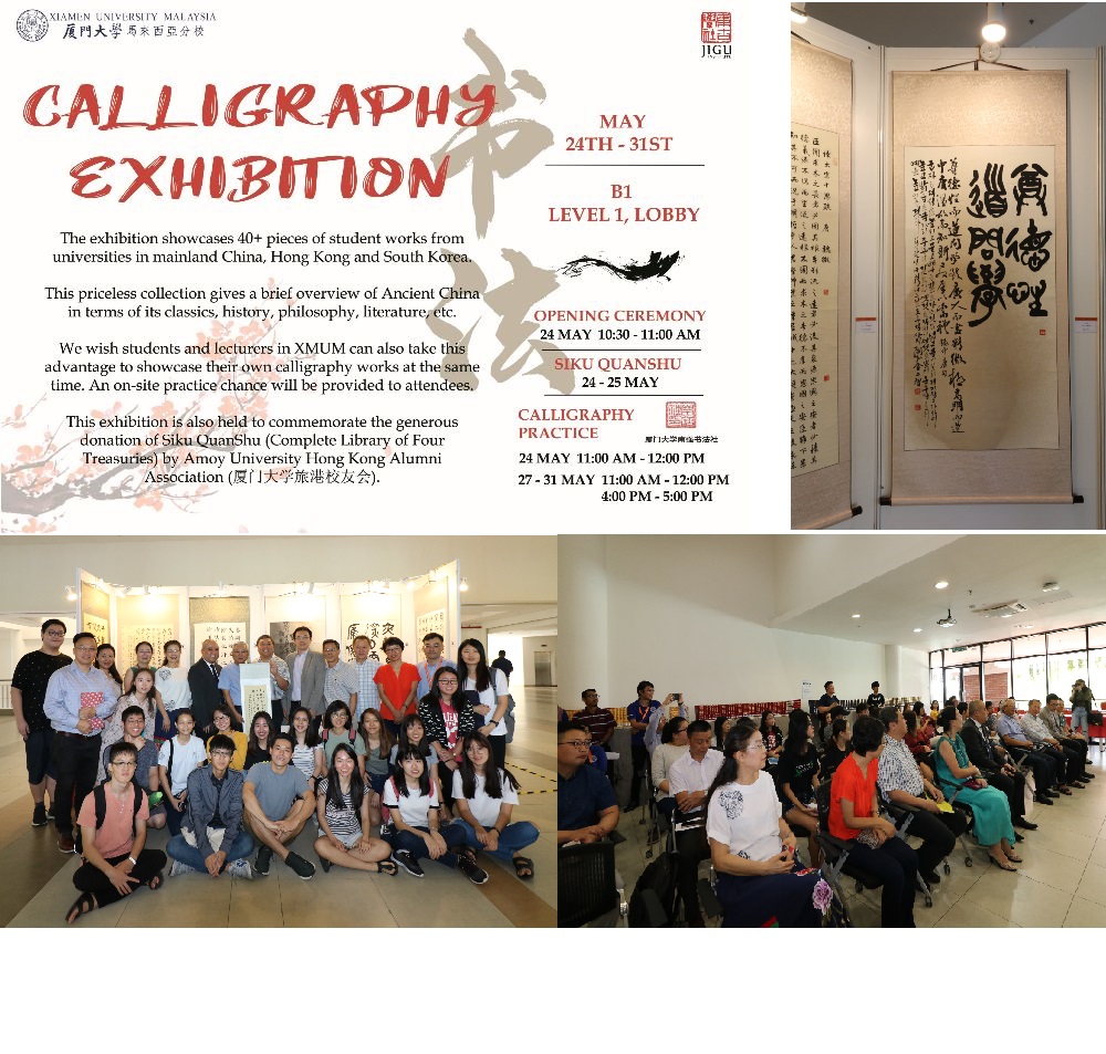 Science and Art—Sino-Korean University Students’ Calligraphy Exhibition was showcased at XMUM on 24th ~31st May 2019. More than 40 student works from 10 universities in mainland China, Hong Kong and South Korea were exhibited on the first floor of the Student Activity Center (Block B1). The works of the students from Calligraphy Society were also exhibited, as a special group at the same time. Mr. Xiaolong LI, the representative of the Hong Kong Jigu Society, has directed XMUM Library and IT team to arrange on the exhibit.